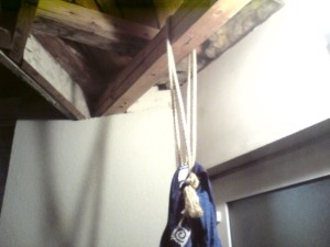 The kettlebell and the stool I used for the pistols. To add some variety, I’ve decided to do them with extra weight today – that’s where said kettlebell comes into play. Due to my ankle injury, I did box-pistols for my left leg. Hence the stool. Also for the sake of variety, I used my rope (which is usually used in kids and youth classes for strength-building games) for the pullups. The first 5 sets I did only with the rope, for the last five I’ve combined it with the towel.