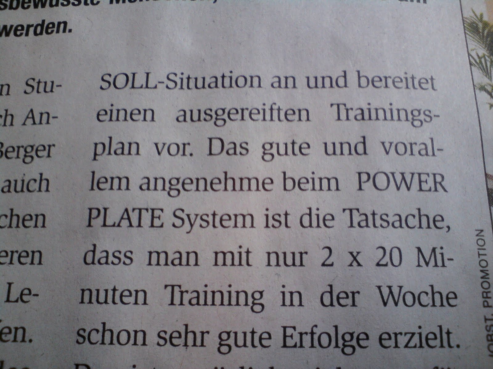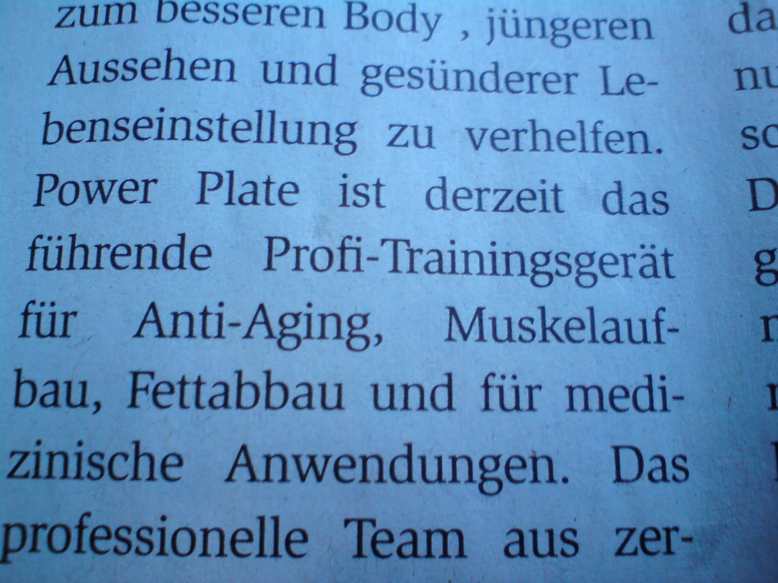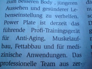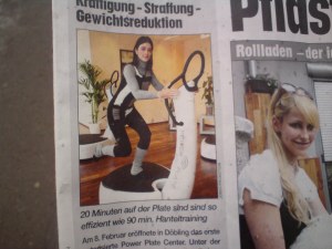 On the cover page I found a teaser for an article that deals with the first „Power plate“ studio in the district. In case you don’t know, a powerplate is a vibrating device onto which one steps in order to „train“. The basic concept is that the body will reach with muscle tension to stabilize itself on the vibrating surface. This, in turn, is – of course – believed to strenghten the muscles and burn calories. Combined with basic calistenics and isometric holds, this training method has been employed by some professional athletes as a supplementary tool.
