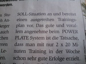 „The good and convenient thing with the POWER PLATE sytem is that very good results can be seen with as little as 2 x 20 minutes per week.“ Ok, now I guess that statement can only be evaluated if you define the term „very good“.