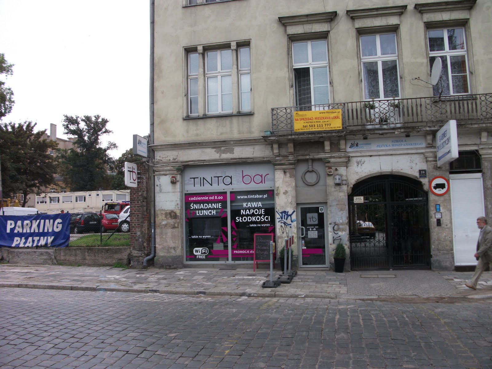 The above paragraph is important for the story, as it explains why finding a place to eat is not always easy for me. Of course, we could have just hit some fast-food restaurant and consume enough calories to last the day, but that definately isn’t my idea of celebrating a meal while on holiday. So, we were looking for a really nice, affordable and comfortable place to have breakfast. That’s when we found the Tinta Bar (http://www.tintabar.pl/). Now from the outside, the Tinta Bar is totally unspectacular, definately not something a tourist would normally visit. The building’s facade isn’t in a good state and although the location is pretty central, it’s easy to overlook the storefront. Said storefront is designed pretty straight-forward, without any gimmicks, eye-catchers or neon-colored signs advertising special offers. It’s all kept very clean and rather simple. Coming from a Zen-oriented martial art, this immediately appealed to me. The sign said they served breakfast, so I was all game to enter. My girl, too, liked to place so we decided to give it a try. Take a look at the next picture and you’ll get an idea of the place.
