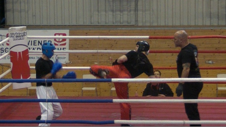 Since the fight was under light-contact rules, I decided to make heavy use of the lead leg. When every hit scored, regardless of effect, this is a good way to control the ring. Alfredo tried to deal with that situation by moving sideways a lot and rushing me whenever he saw a chance. Basically, that strategy could have worked – however, in the heat of battle, he often put his head down and seemed to lose orientation a bit. On most of the exchanges, I was able to gain the upper hand.