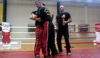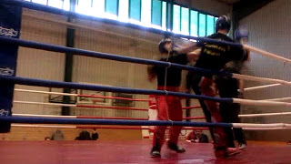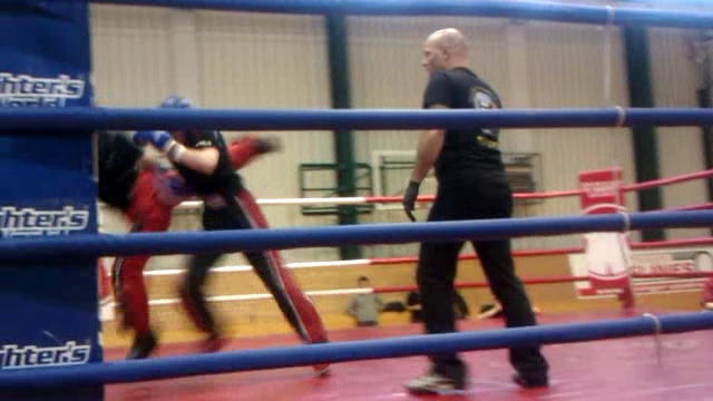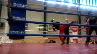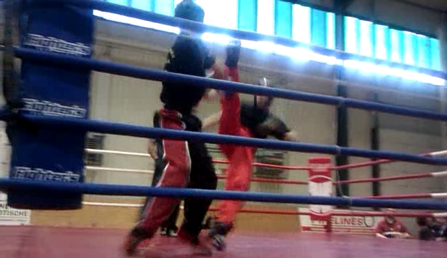 Another thing that worked well for me was switching to an open stance (i.e. right side forward when he’s leading with his left) and attacking with a rear roundhouse kick to the body. On the mat, Yuri would just have taken a step back to evade the attack. In the ring, however, his retreat was blocked by the rope, so I had a chance to follow up with strikes. I’ll definately have to work on mixing those two elements up, i.e. poking with the lead leg to get the other guy in an unfavorable position (for him), then hammer him with a rear roundhouse and follow up with strikes.
