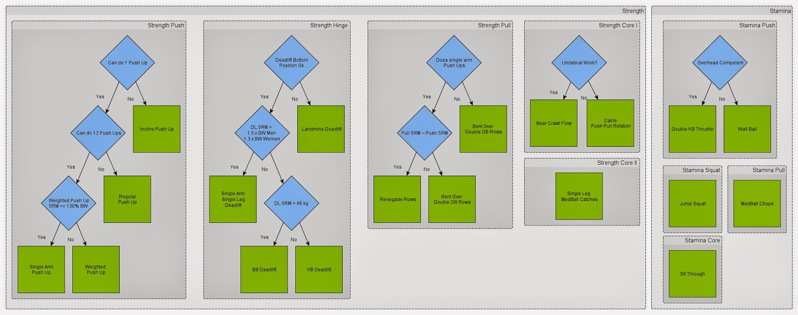 Strength: Lunge variations (chosen after an initial assessment, see chart below) (Squat pattern, anti-lateral-flexion, anti-flexion), Overhead pressing variations (vertical push, anti-extension) if feasible according to initial screen, otherwise go for landmine presses, Pull-Ups (vertical pull, anti-extension) for the overhead competent, chin ups otherwise (more horizontal angle in bottom position), Side planks (anti lateral flexion), Paloff Press (Anti rotation)
