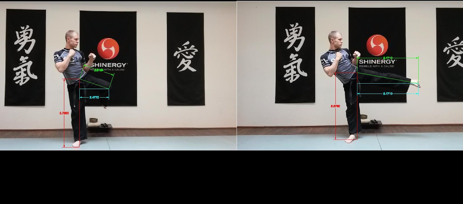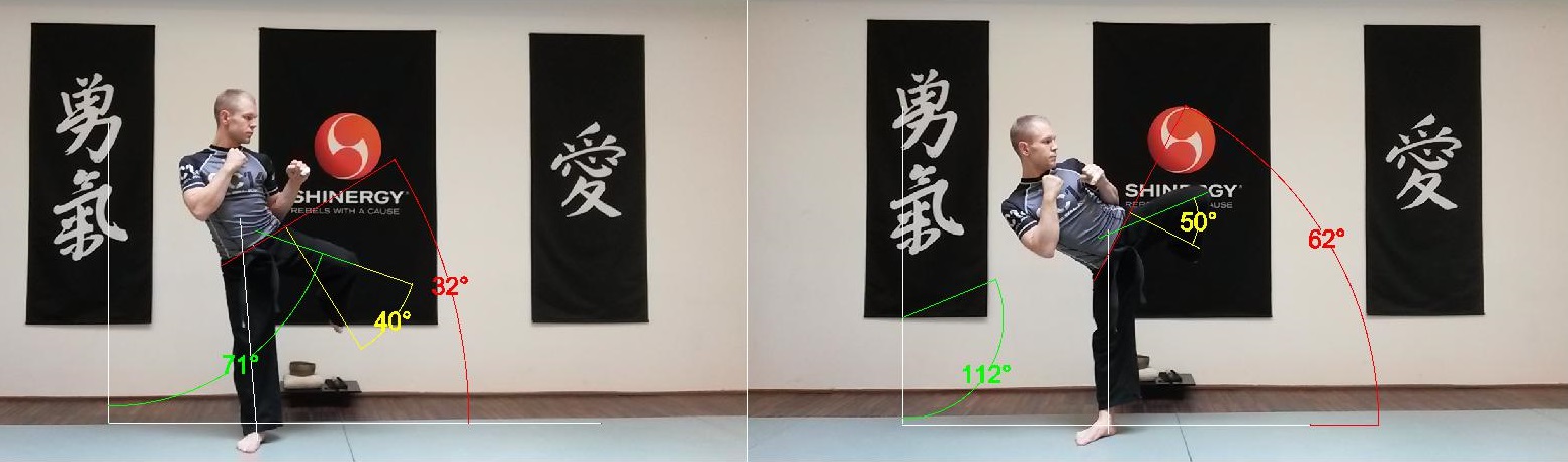 Think about it. In order to kick high, you need a nice abduction in that kicking hip. However, that abduction is quite limited, so it needs to be combined with an abduction of the supporting hip as well. This will tilt your pelvis in such a way that you need less supporting hip abduction to reach your target. Basically, we’re talking about distributing the load over two hips instead of overloading one. There’s more to that, such as anatomical limits regarding abduction, so regardless how strong your hips are, there’s no two ways about it – you need to tilt that pelvis. Figure 2 illustrates the concept. In the left picture, I’m basically abducting my kicking hip as far as I can without tilting my pelivs (at least, I’m trying to keep my pelvis level, but that’s nearly impossible). The red line indicates the pelvis level. Perpendicular to that is the yellow line – basically this is where my leg would be if my pelvis was in neutral position and gravity was acting on the leg (or, conversely, if I was in anatomical neutral and there was no gravity). In other words, this is where the leg would be if I were standing. We use this to measure abduction. Green is the leg’s spatial alignment. As you can see, in the left picture, my kicking leg abduction is somewhere near 40 degree, while in the right picture it’s about 50 degree. That’s roughly a 10 degree difference, which already makes a difference, but might stem from the fact that I was trying to keep my pelvis level in the left picture, so a slightly higher abduction might have been possible. Also, keep in mind that the presented geometry is rather a rough approximation. Despite that 10 degree difference in kicking leg abduction, total difference sums up to roughly 40 degree – most of that comes from the abduction of the supporting hip. That abduction in part comes from muscular strength, but note my torso angle – by intelligently shifting weight, the supporting hip naturally abducts with little effort.