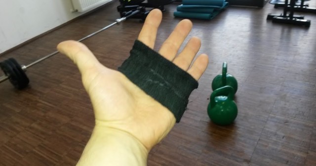 Hand care also becomes an issue when training with kettlebells for high volumes. Pavel Tsatsouline [TSAT2016] offers solutions to this issue. Cutting the elastic part of sports socks and using it to protect the palm as presented in Figure 4 has proven invaluable in practice.