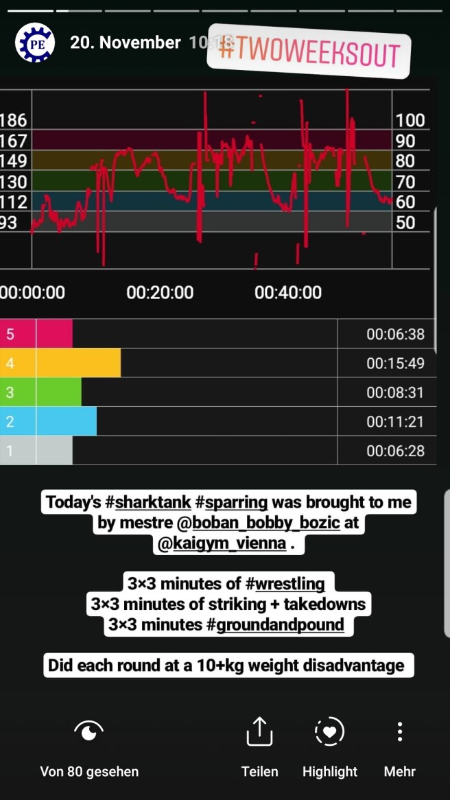 For the grappling aspects, I prepared at KaiGym Vienna, training under the ken eye of Luta Livre Black Belt Boban Bozic. On Monday and Wednesday, I can only take the AM classes, as I am teaching evening classes myself. As everything in life, training in the morning has some advantages while it also brings some disadvantages. On the one hand, classes are smaller in the morning compared to evening, so athletes get more one-on-one attention from the instructor. That is definitely a positive point. Also, especially during the final weeks of fight camp, Bobby and Georges were cool enough to really consider my preparation and tailor a lot of the classes to my needs (or at least, offer a lateralization when the concepts that were planned for the particular day did not necessarily apply to an MMA setting). In a larger group, that is much harder to do. On the other hand, most fighters work out in the evening, so I id did not always have sparring partners. Luckly, most of the time I had Patrick, who is a brown belt himself and a great training partner. On Fridays, especially early in the camp, I took both the AM and PM sessions to get seome harder rolling in. Now the thing is that while the Friday evening class is packed with high caliber grapplers, it is also very grappling specific (which makes sense in a grappling class, I guess) and not necessarily geared towards MMA competition.I did most of my striking training at the Shinergy Base Vienna, working with Shinergy Black Belt Elias and Shinergy Founder Ronny. The training mostly revolved around specific situational drills that we derived from watching videos of my opponents previous fights. Also, there was a heavy emphasis on padwork and energy system development (ESD). I will cover the progression of my ESD progression in a later section of this article.Saturday is traditionally the sparring session at my own Gym, Shinergy Stadlau. Considering the fact that most events take place on Saturday, that makes sense, I guess. I have some great fighters who helped me prepare for my bout, first of all Dominik and Johnny. While the former is a brilliant boxer who can really put on some pressure, the latter is an awesome allrounder and hence, was my go-to person for MMA style sparring. Usually, the sessions involved mixed-modality shark-tank sparring. For example, I would box with Dominik for a minute, have Johnny jump right in, wrestle (with punches and knees) with him for a minute and then have Dominik take a dominant position on the ground (usually the mount) and hammer me with punches. in one session, I was extra „lucky“ to have Felix, a friend of Johnny’s, visit the gym, so I took him into the rotation. Now I use parenthesis around the work lucky for a good reason. You see, Felix is a BJJ purple belt, so in a shark tank, after going hard with kickboxing and wrestling for two minutes, being in an inferior position against a superior grappler is the last thing you want. It just might be what you need, though. During the last weeks, Bobby set up some MMA specific circuits to emulate that intensity even when I did not have sparring partners that would crush me.