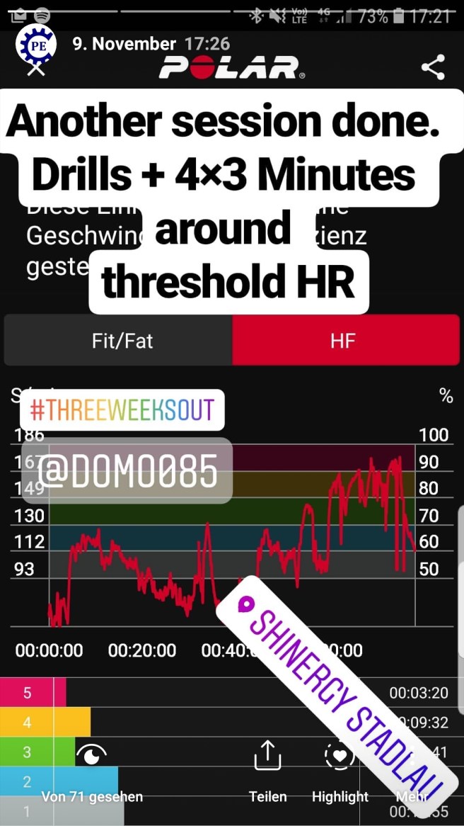 In October, I primarily did aerobic explosive repeats and some more cardiac output work. Building on that, in November I progressed to a cardiac power block and focused on caridac power intervals (CPI) and threshold training. I honestly hate CPI, but if nothing else, they sure build willpower. Basically, the idea is to raise the heartrate to the absolute max and keep it there for a certain time. This is even less fun that it sounds. I did the first sessions on the threadmill, sprinting at 22 kmh for 90 second intervals. Not impressive, but keep in mind I am a fighter, not a track and field athlete.