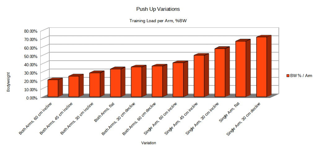 The following Figure ranks pushup variations according to their relative intensity. Each bar in the chart represents the training load that is placed on one arm. Interestingly, even the easiest single arm variation, with a 60cm hand elevation, is harder than the decline pushup with a 60cm elevation of the feet. This again points to a problem with calisthenics-type exercises: difficult scalability. Assuming a bodyweight of 80kg, a 60cm elevation of the feet yields a total load of around 47Kg, which translates to 23.5Kg for one arm. In contrast, a single arm push up with a 60cm hand elevation will result in a training load of approximately 33Kg for the working arm. That is a 29% difference in training loads. Putting those values into the Epley 1RM equation indicates that an athlete needs to be able to perform 12, 60cm decline push ups before doing a single 60cm incline push up. This does not take into account the increased complexity of the latter that comes from the stability demands in the transverse plane.